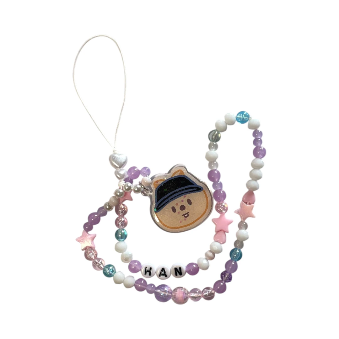 Strap en cuentas de acrílico y murano con dije resinado doble cara — en los colores característicos del personaje. Con el nombre del idol en letras, corazones, flores y detalles que lo hacen único.