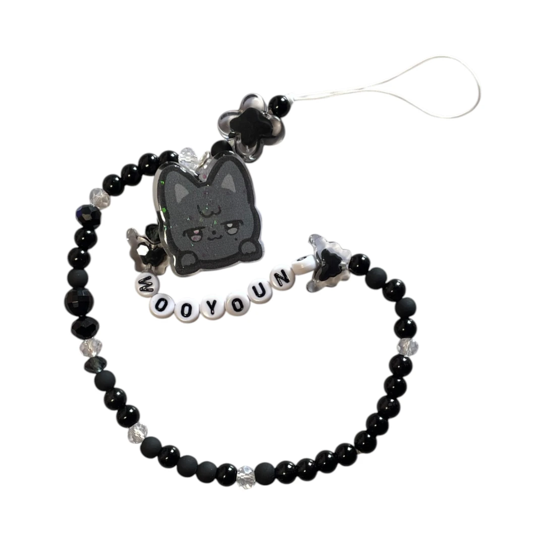 Strap en cuentas de acrílico y murano con dije resinado doble cara — en los colores característicos del personaje. Con el nombre del idol en letras, corazones, flores y detalles que lo hacen único.